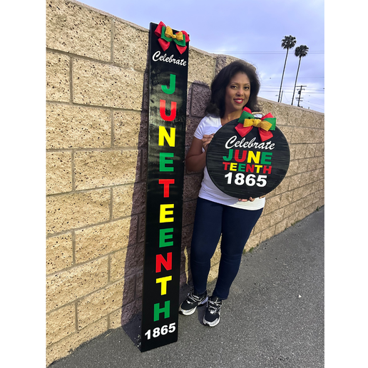 Showcase your Juneteenth celebration with our premium pine wood door hanger wreath. Precision-cut from authentic pine (not particle board), this 17.75" x 18" x 0.5" round accent features durable outdoor vinyl lettering and includes a professionally secured bow and hanging ribbon. Each piece is uniquely characterized by natural wood grain variations and sealed for weather resistance, making it ideal for covered entryways. This handcrafted statement piece combines craftsmanship with cultural significance for a meaningful holiday display.
